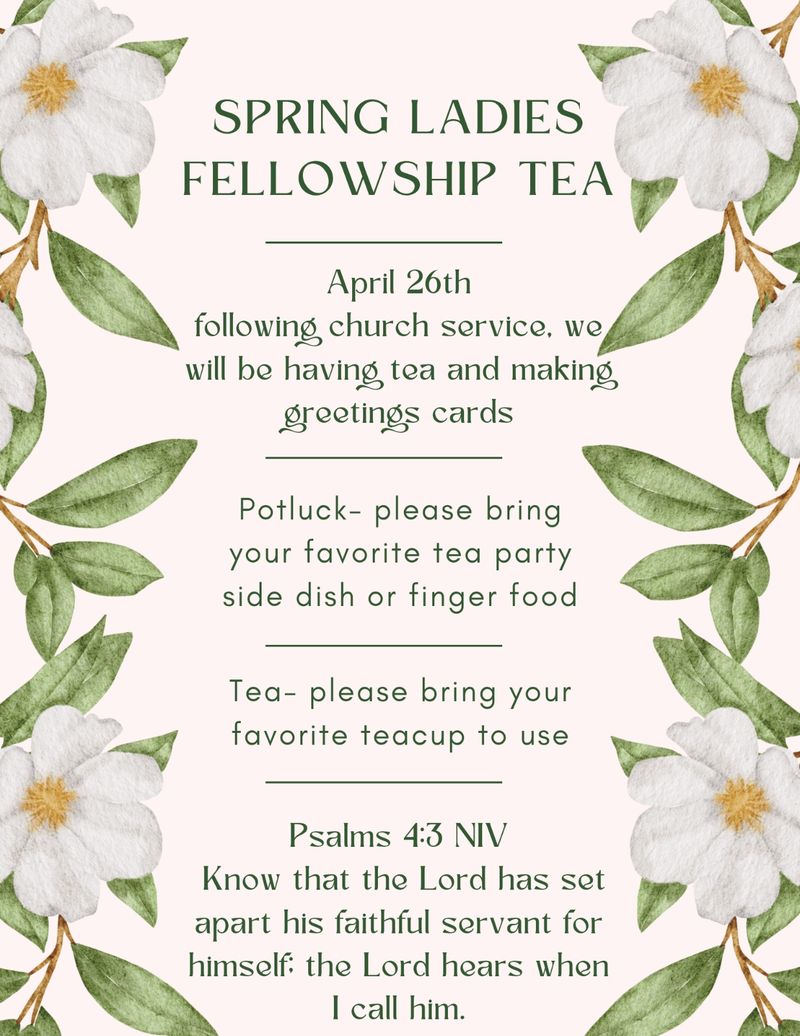 Please join us April 26th after church for a devotional, tea, and greeting card fellowship. This is potluck - bring your favorite tea party side dish or finger food.